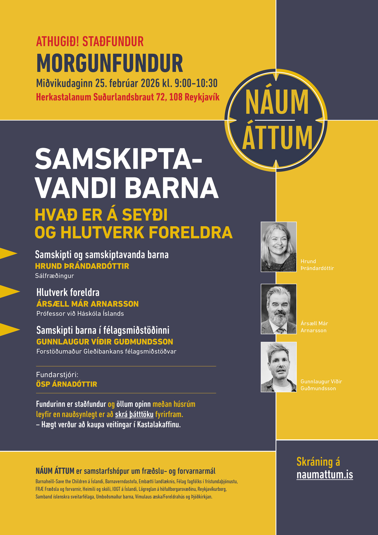 25. febrúar 2026: SAMSKIPTAVANDI BARNA – Hvað er á seyði og hlutverk foreldra Samskipti og samskiptavanda barna Hrund Þrándardóttir Sálfræðingur Hlutverk foreldra Ársæll Már Arnarsson Prófessor við Háskóla Íslands Samskipti barna í félagsmiðstöðinni Gunnlaugur Víðir Guðmundsson Forstöðumaður Gleðibankans félagsmiðstöðvar Upptökur frá fundinum By heimir|2026-03-08T15:07:08+00:00February 25th, 2026|Fyrri fundir 2026|0 Comments Share This Content! FacebookTwitterLinkedInTumblrPinterestEmail